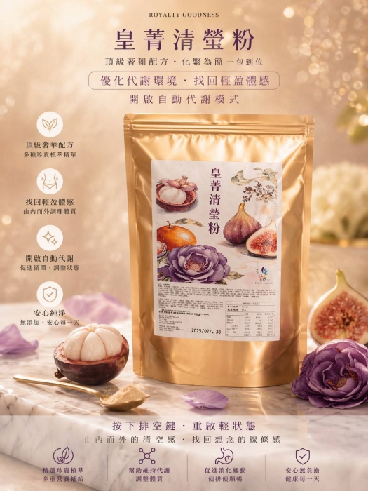@皇菁清瑩粉是一款融合山竹果、紫山茶花、無花果、滕黃果、裙帶藻、綠茶、薑黃等植物萃取及多種天然莓果、綜合蔬果酵素、多種高量膳食纖維等機能飲品,入口時,果香在舌尖中綻放,層次堆疊的幽香,讓人彷彿置身於芬芳的森林果園中,不僅能夠幫助維持消化道的機能,改變細菌叢生態,使排便順暢,更有助於調節生理機能,調整體質,養顏美容與促進新陳代謝等多種健康幫助與維持。
